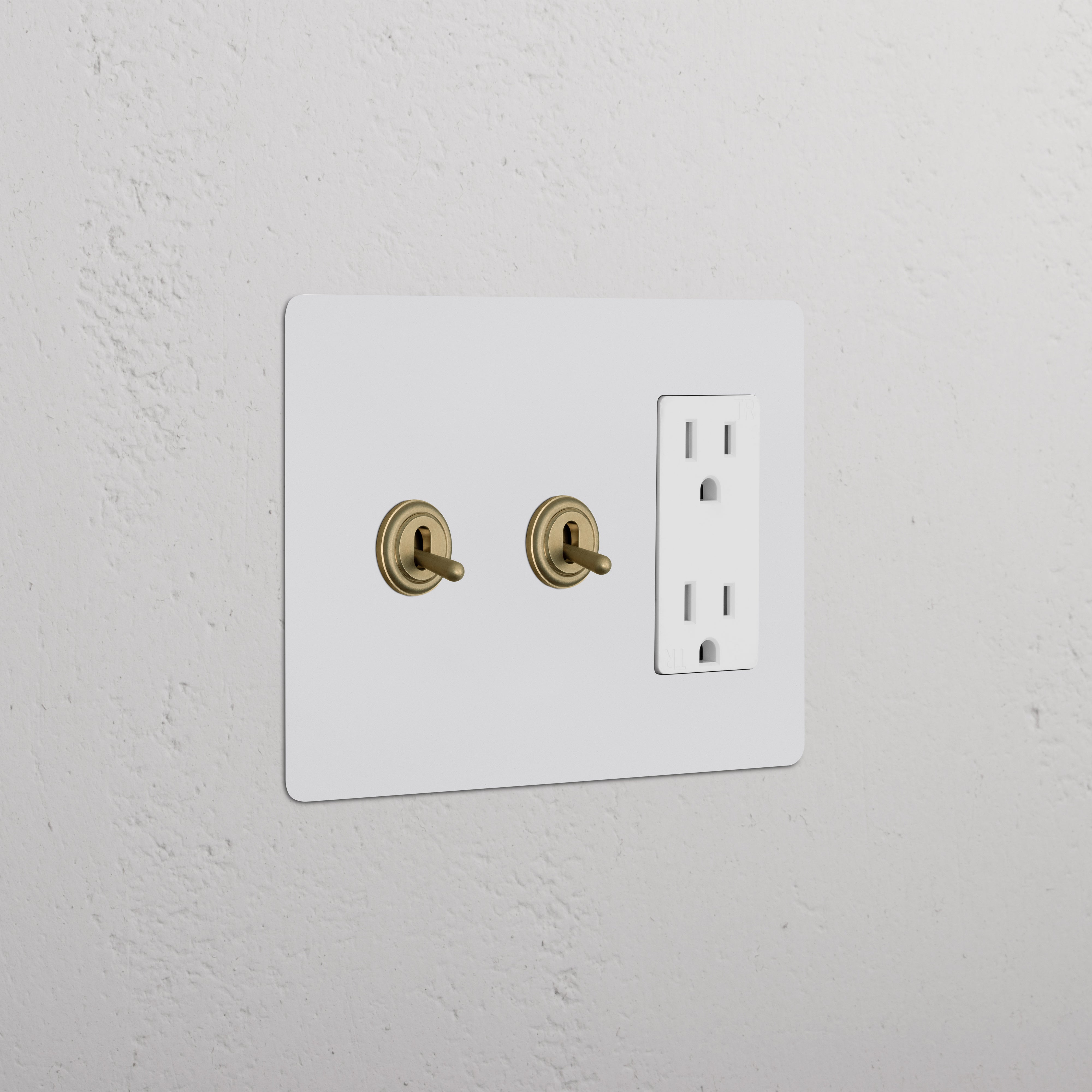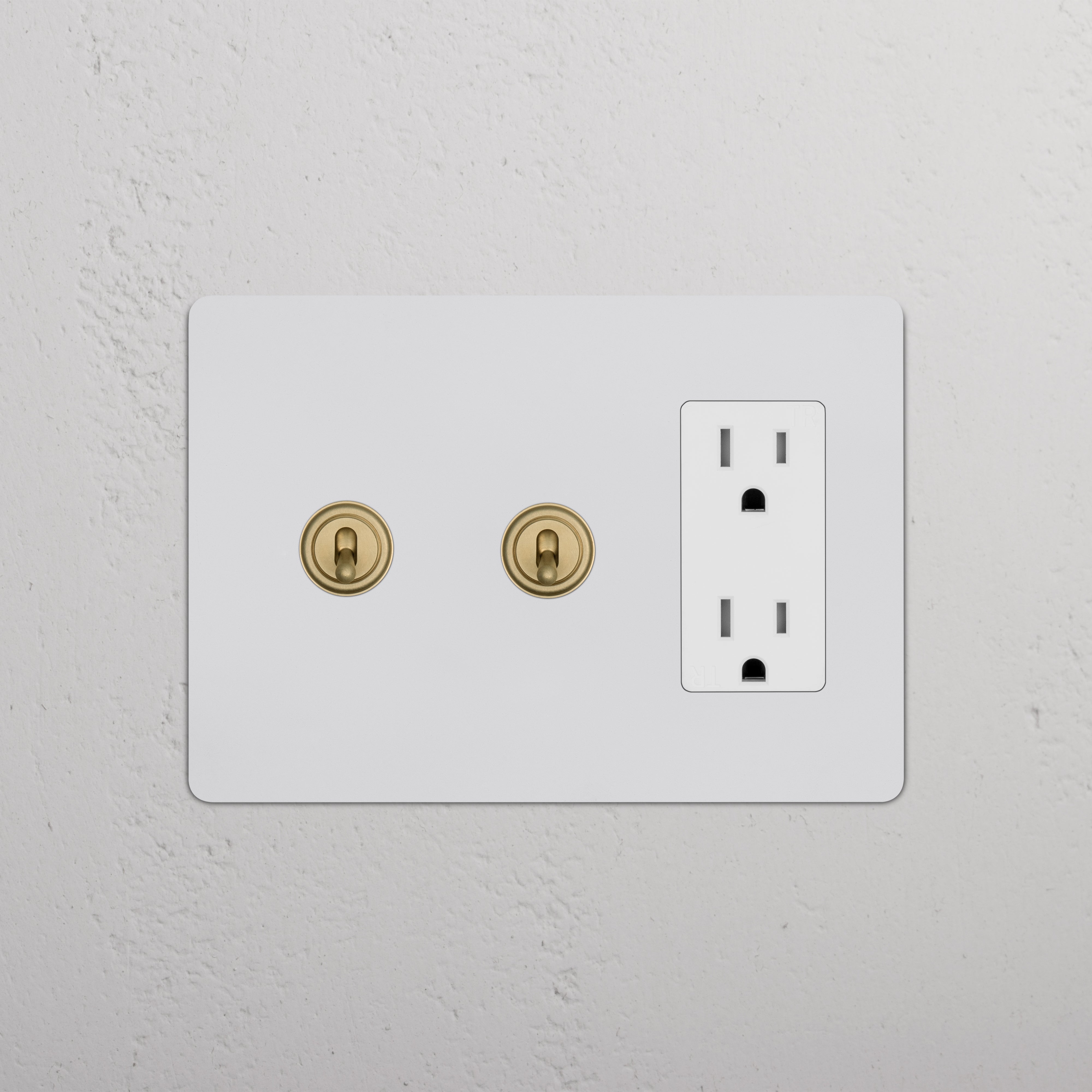 This 3 gang mixed switch and outlet combines two three-way toggle switches and a 15A power outlet on one plate.
