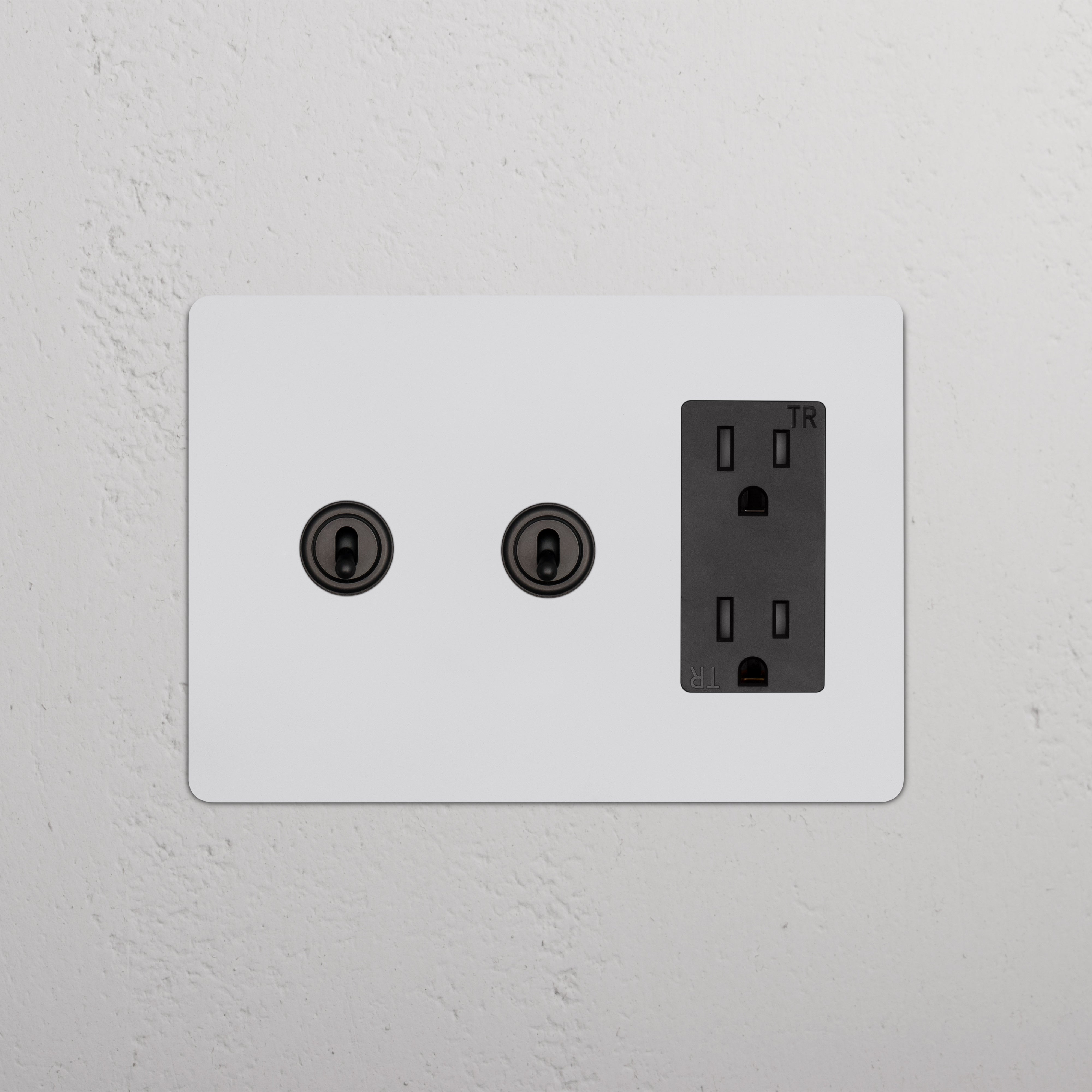 This 3 gang mixed switch and outlet combines two three-way toggle switches and a 15A power outlet on one plate.