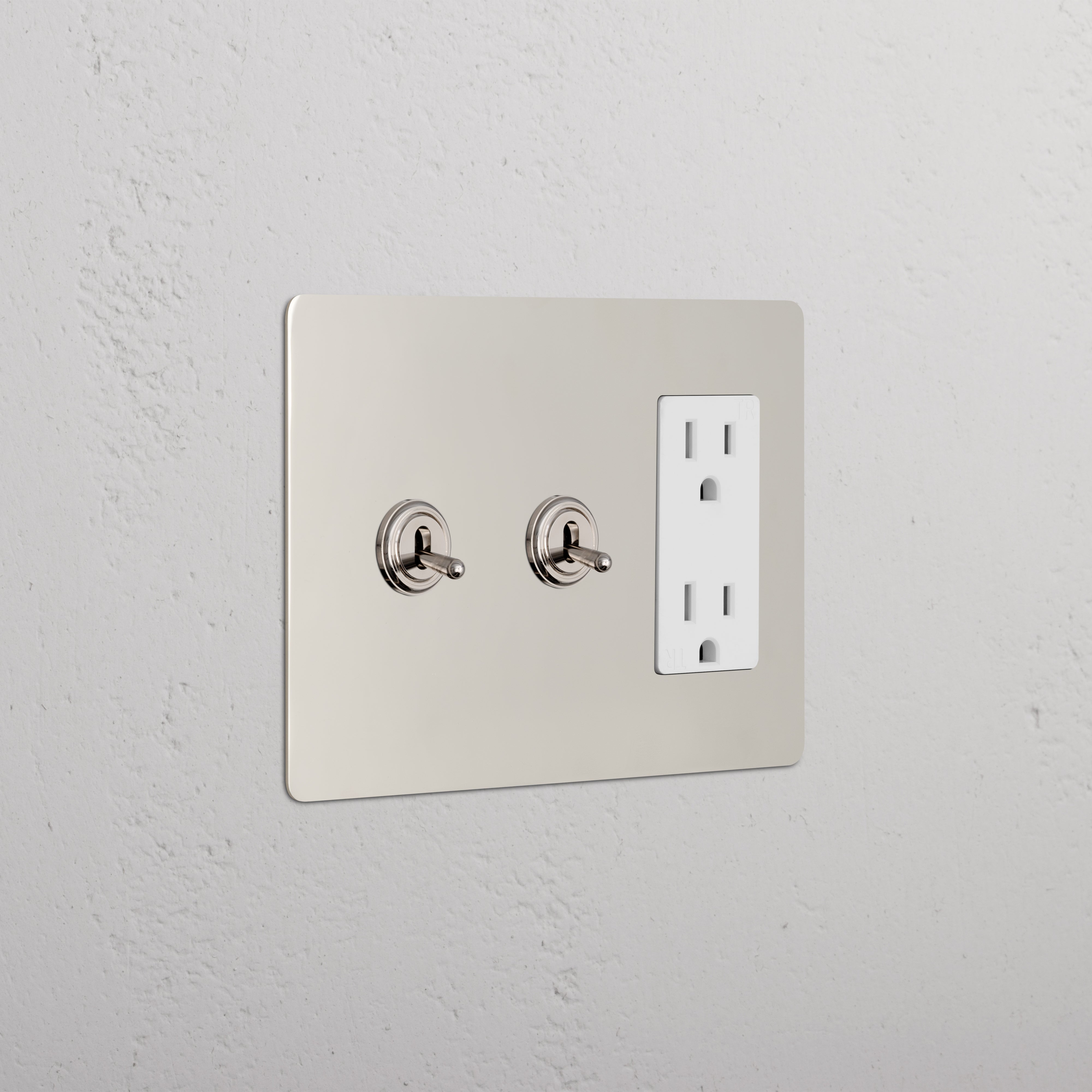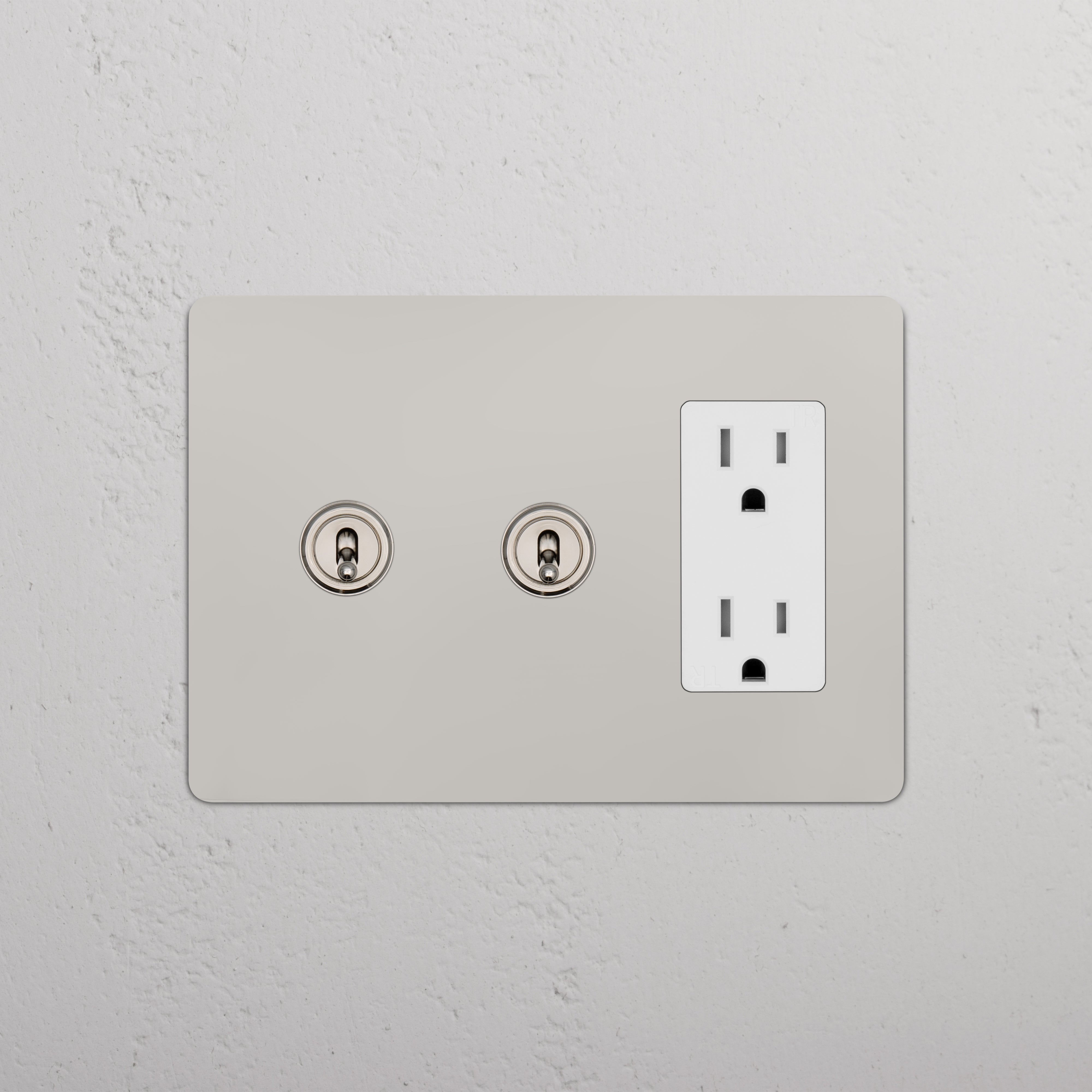 This 3 gang mixed switch and outlet combines two three-way toggle switches and a 15A power outlet on one plate.