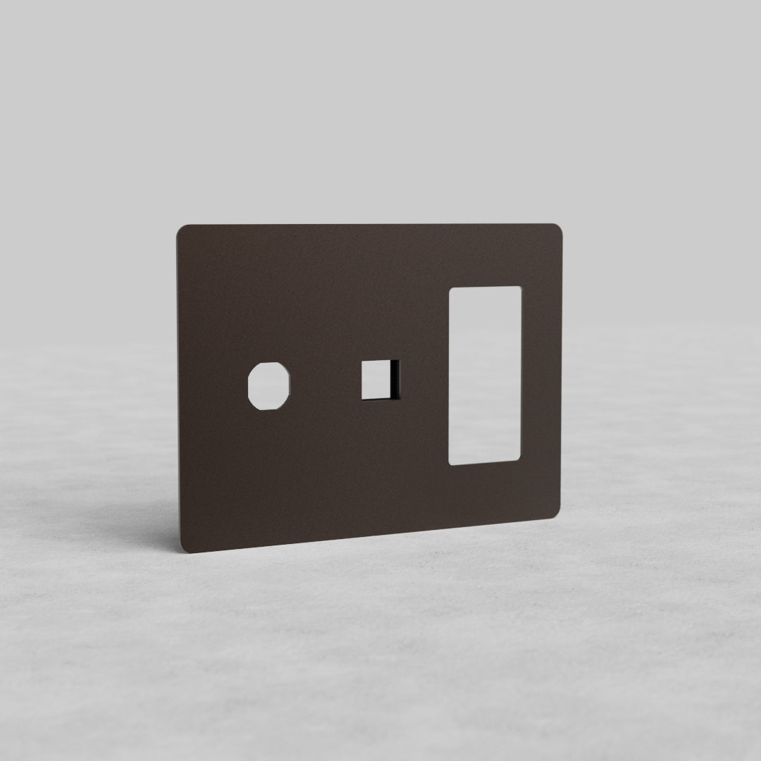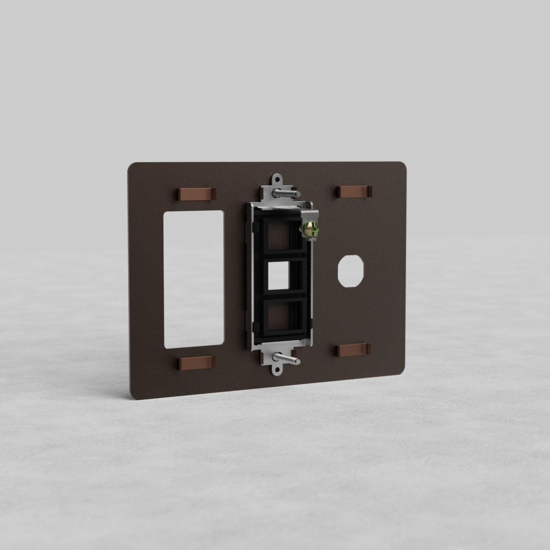 This Kew 3 gang outlet, keystone, and switch plate works with any one of our bronze toggle or rotary dimmer switches, any one of our rocker switches, or outlet modules and any one of our keystone modules (just make sure you choose the ones made with black plastic).