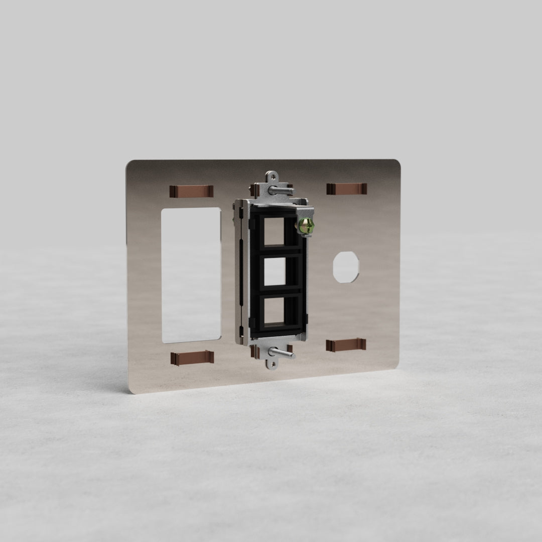 This Kew 3 gang outlet, keystone and switch plate works with any one of our polished nickel toggle or rotary dimmer switches, any one of our rocker switches or outlet modules, and any one of our keystone modules.
