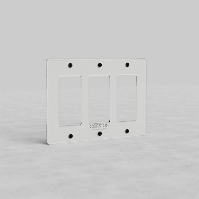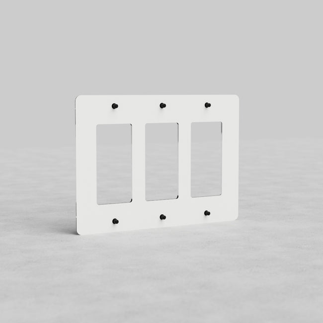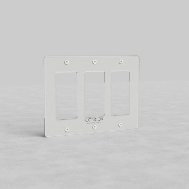 This Kew clear 3 gang outlet plate works with any three of our rocker switches or our outlet modules.