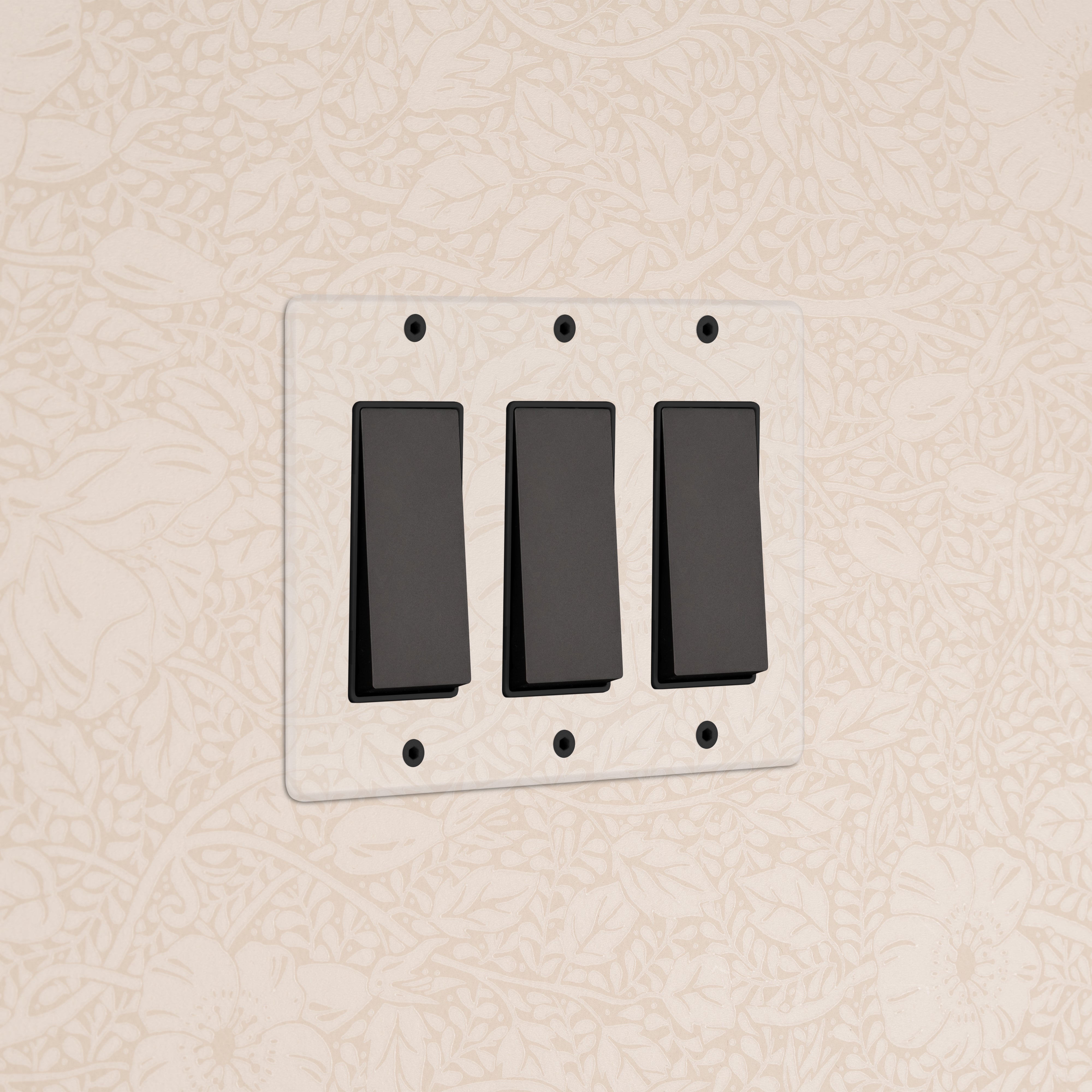 The clear switches and outlets in our Kew collection come with backing paper that you can either paint or use as a wallpaper template. The transparent front plate is then secured over the backing paper to conceal the electrics. All our electrical products should be installed by a qualified electrician.