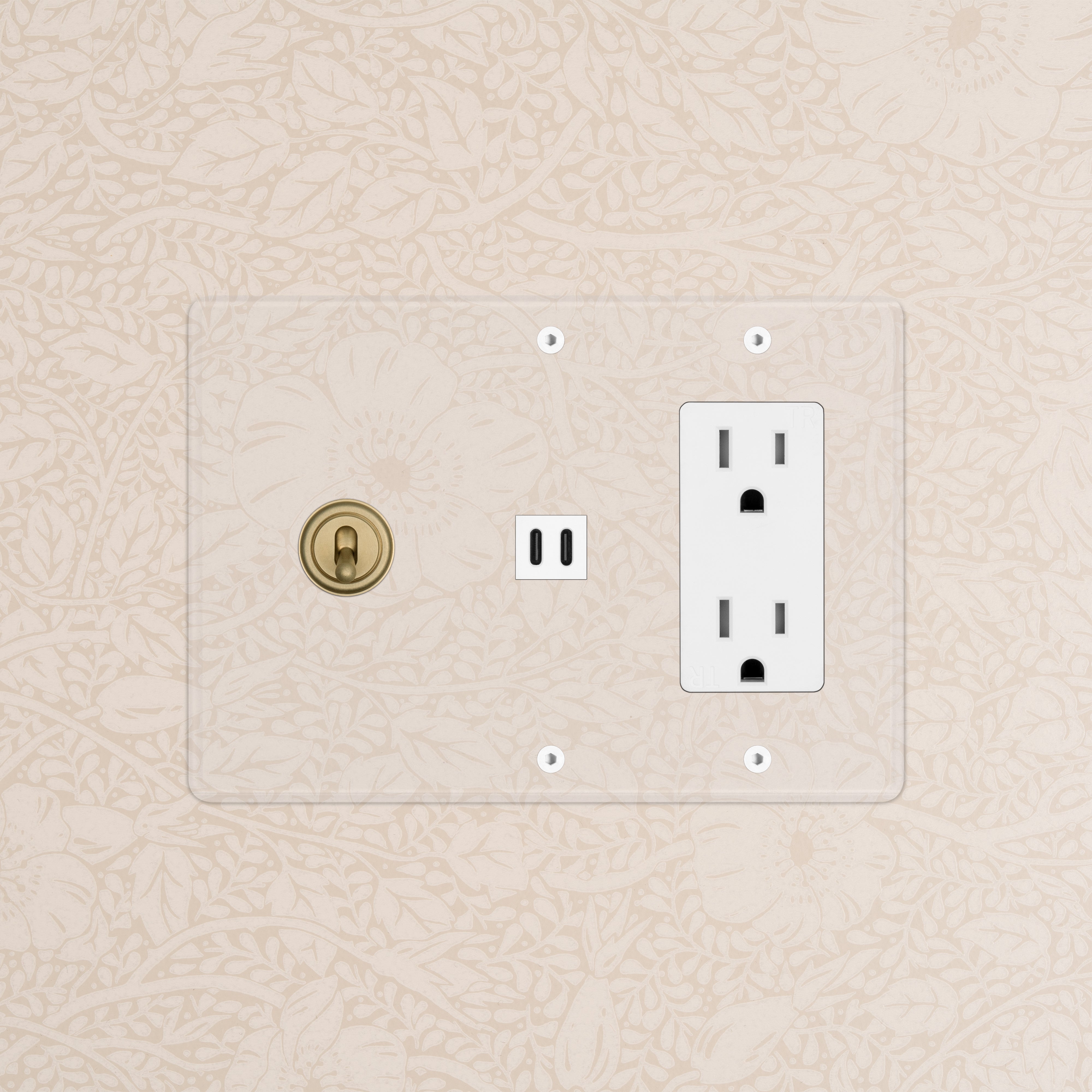 This 3 gang mixed switch and outlet combines a three-way toggle switch, a 15A power outlet, and a fast charge USB-C outlet on one plate.