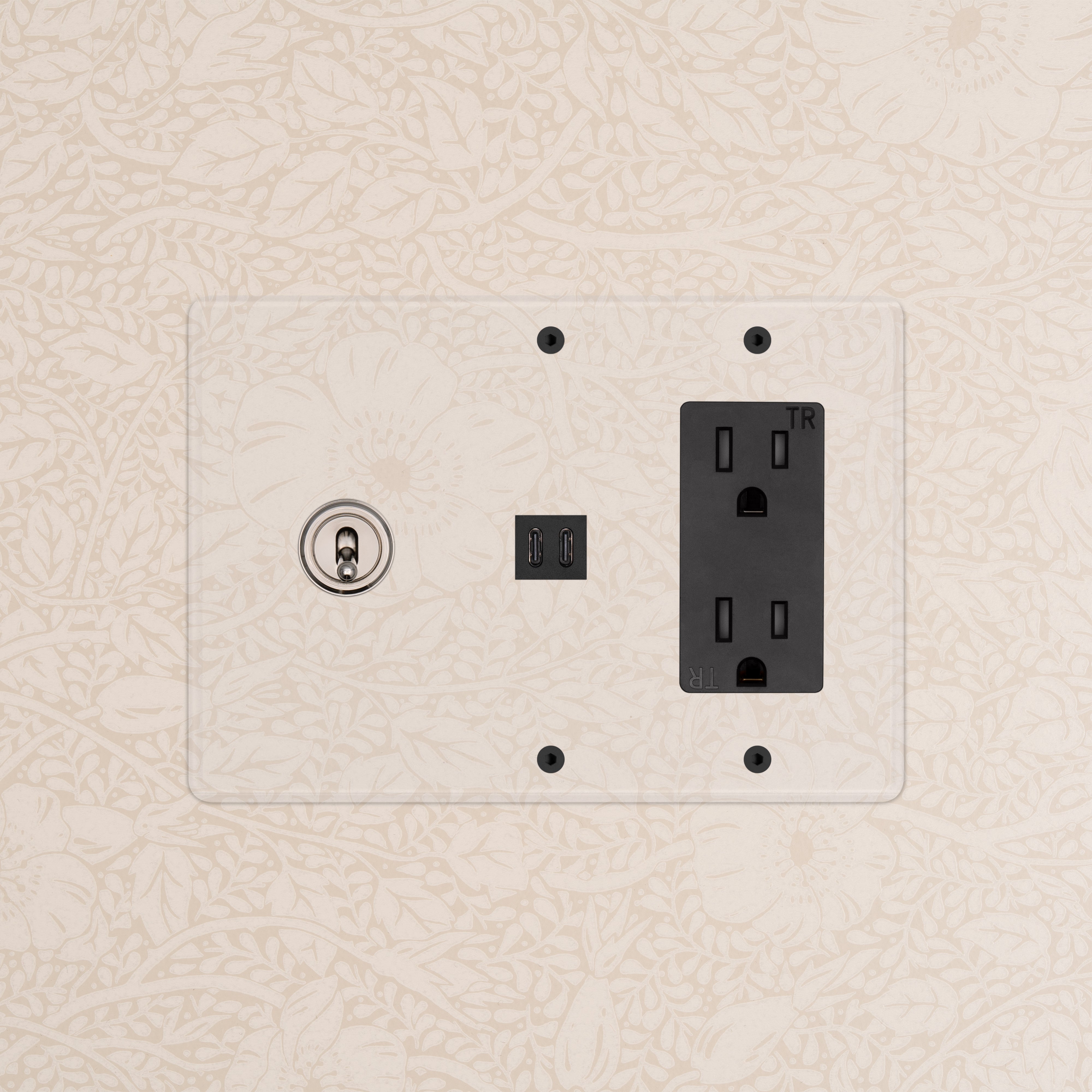 This 3 gang mixed switch and outlet combines a three-way toggle switch, a 15A power outlet, and a fast charge USB-C outlet on one plate.
