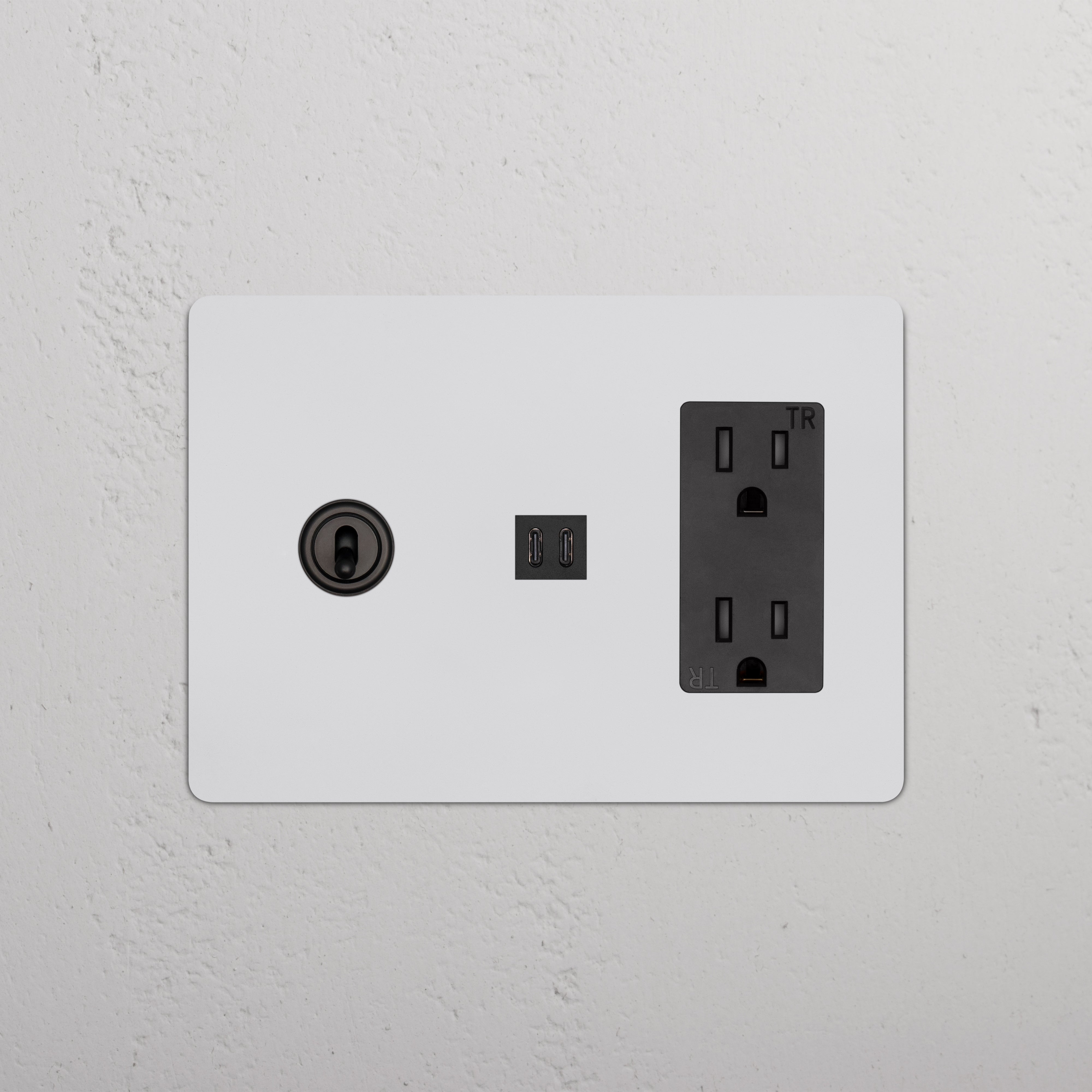 This 3 gang mixed switch and outlet combines a three-way toggle switch, a 15A power outlet, and a fast charge USB-C outlet on one plate.