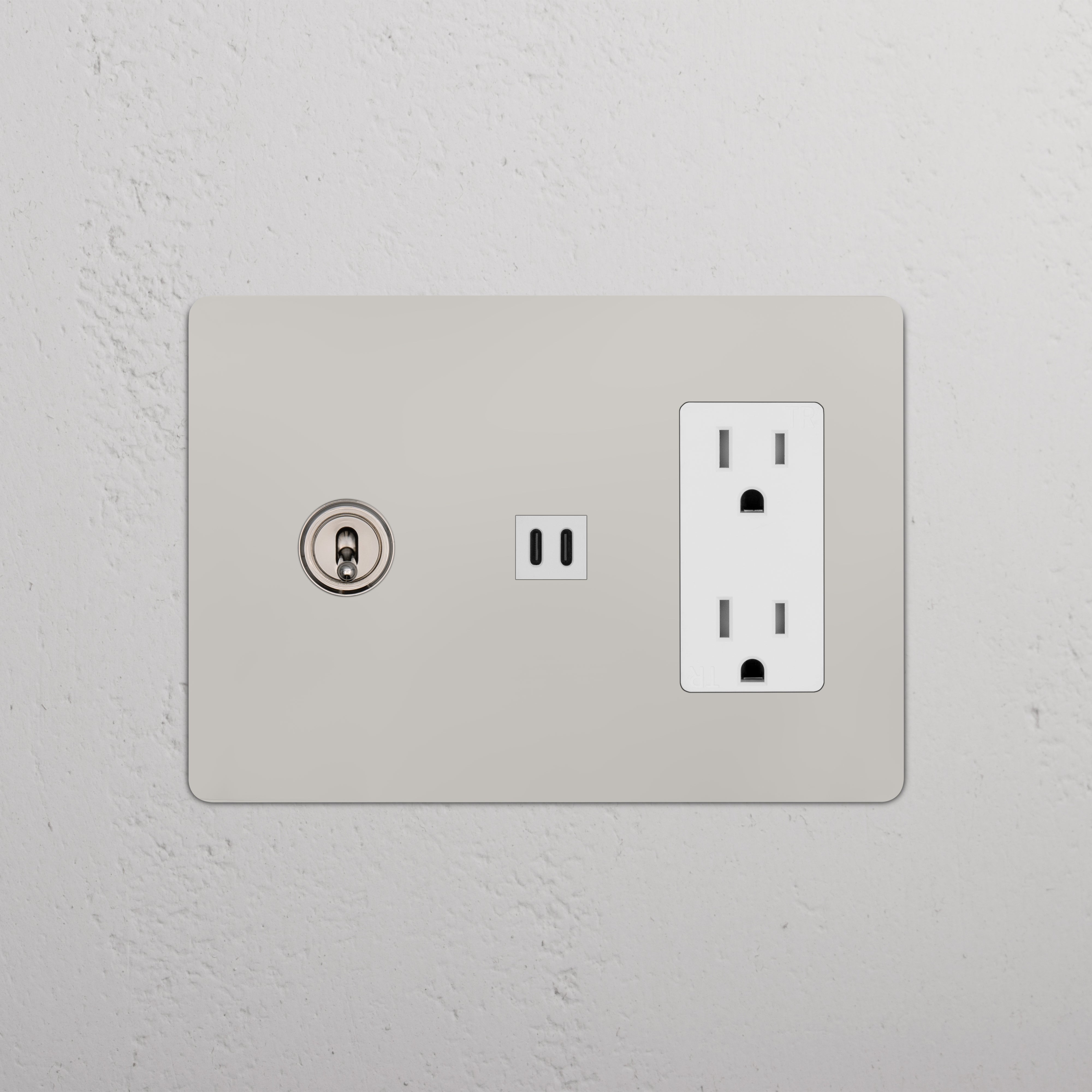 This 3 gang mixed switch and outlet combines a three-way toggle switch, a 15A power outlet, and a fast charge USB-C outlet on one plate.