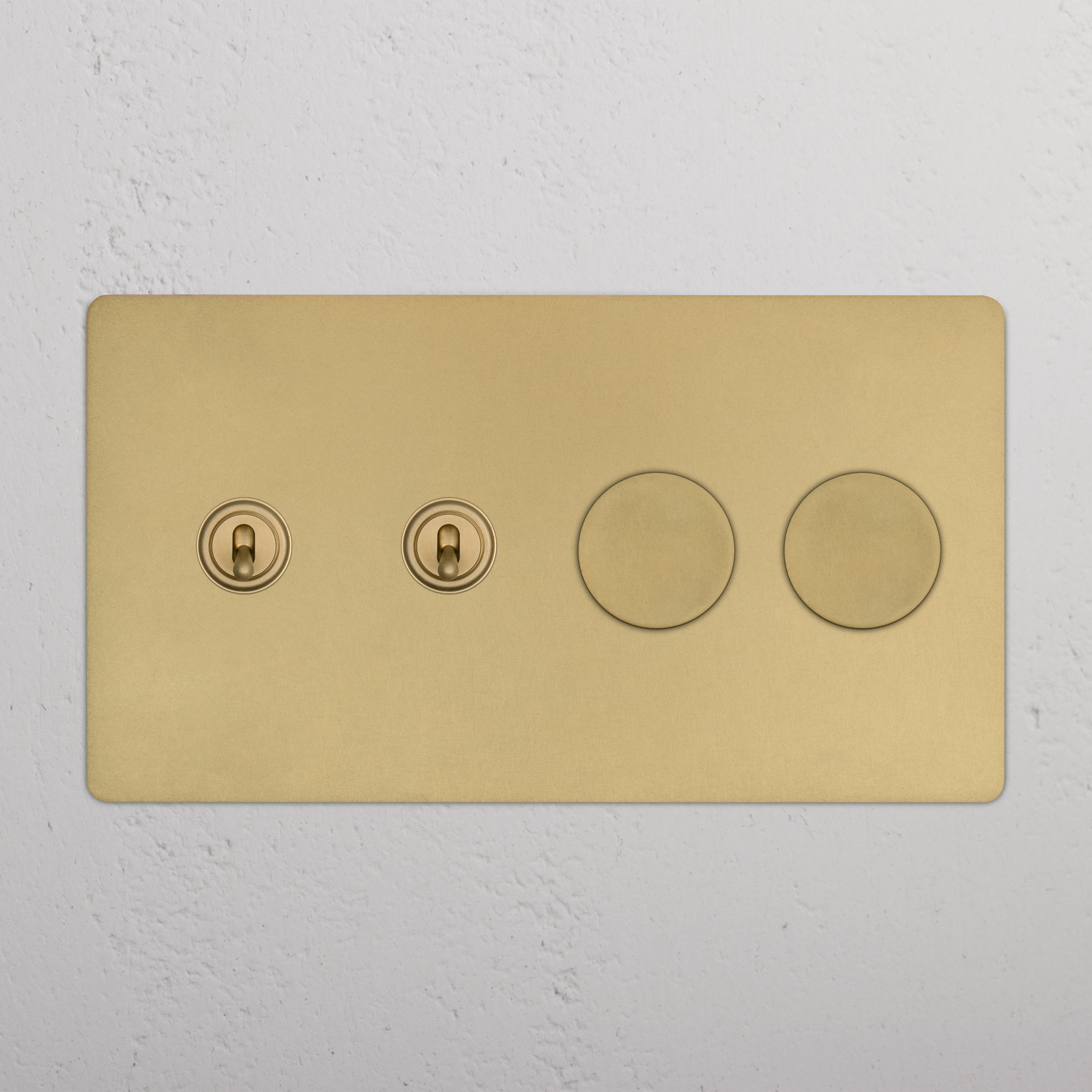 This 4 gang mixed switch combines two three-way toggles and two rotary dimmers on one plate.