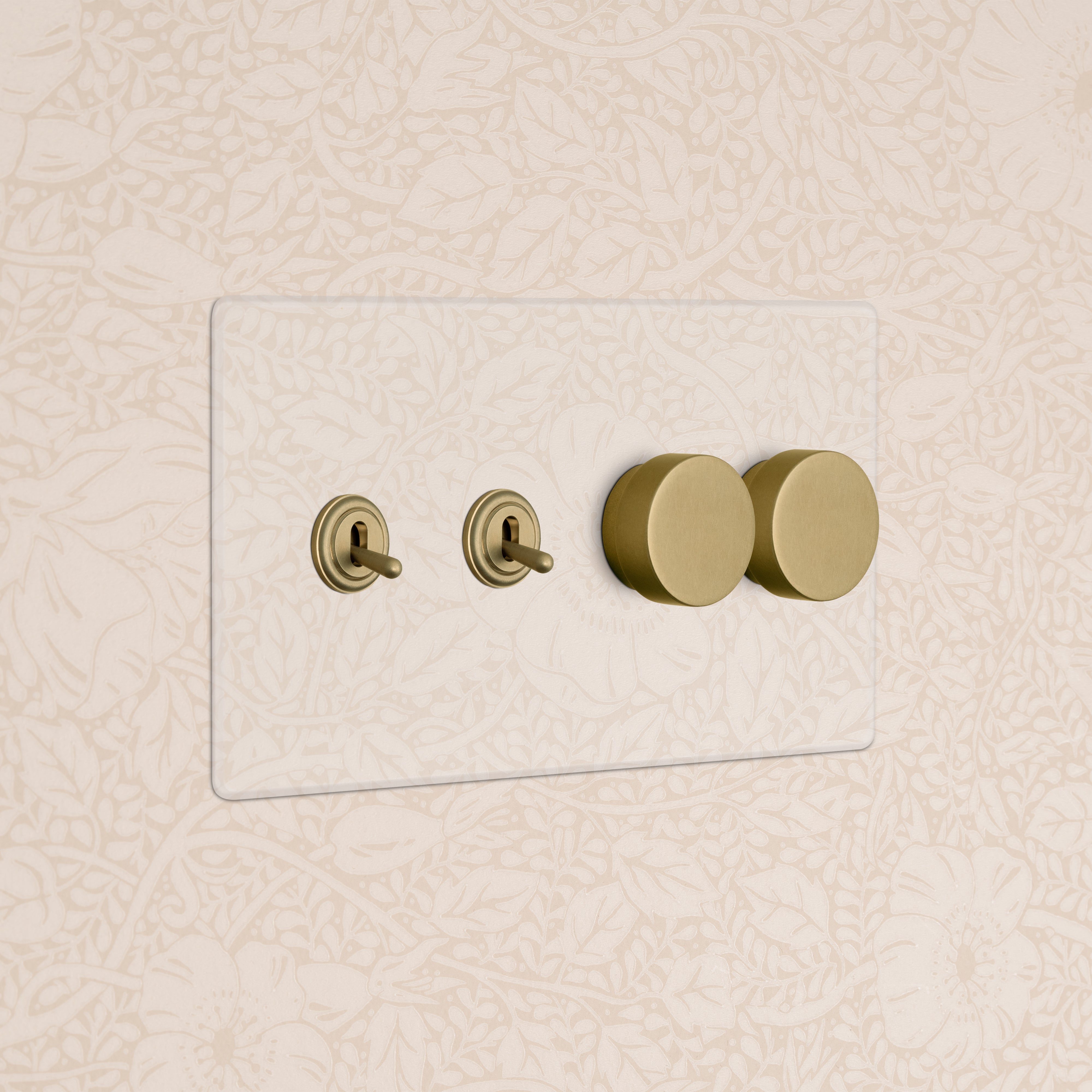 This 4 gang mixed switch combines two three-way toggles and two rotary dimmers on one plate.