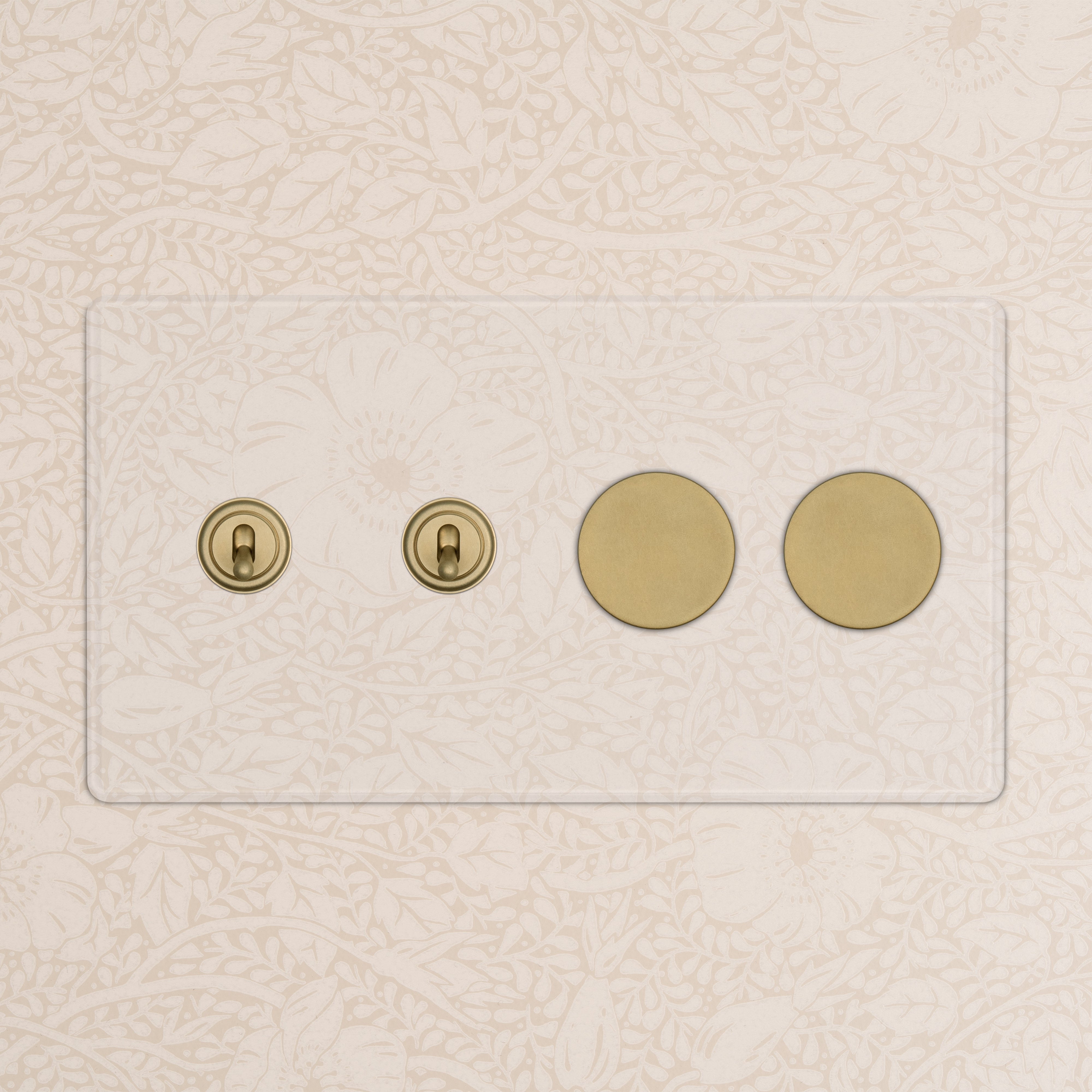 We make our clear collection from polycarbonate, which is more flexible and durable than the usual acrylic. The toggles, knobs, and collars (that sit underneath each rotating knob to hide all the working parts) are made from solid brass in our antique brass finish.