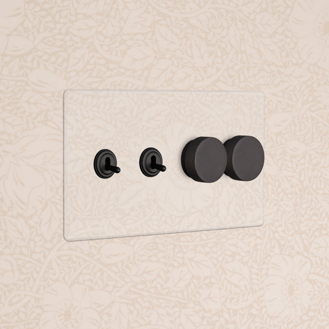 This 4 gang mixed switch combines two three-way toggles and two rotary dimmers on one plate.