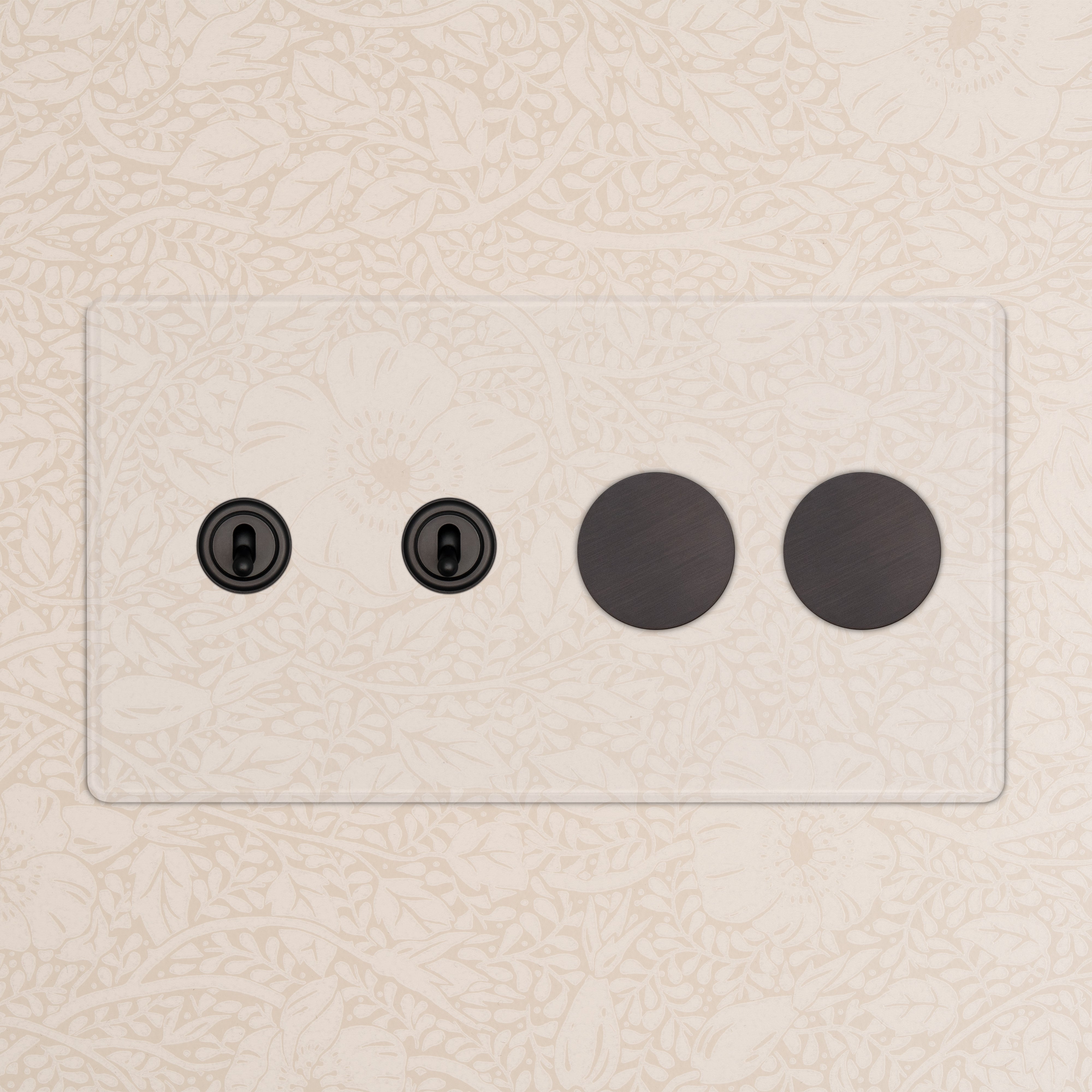 We make our clear collection from polycarbonate, which is more flexible and durable than the usual acrylic. The toggles, knobs, and collars (that sit underneath each rotating knob to hide all the working parts) are made from solid brass in our bronze finish.