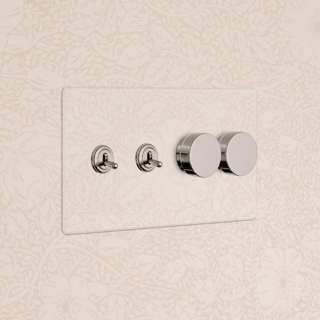 This 4 gang mixed switch combines two three-way toggles and two rotary dimmers on one plate.
