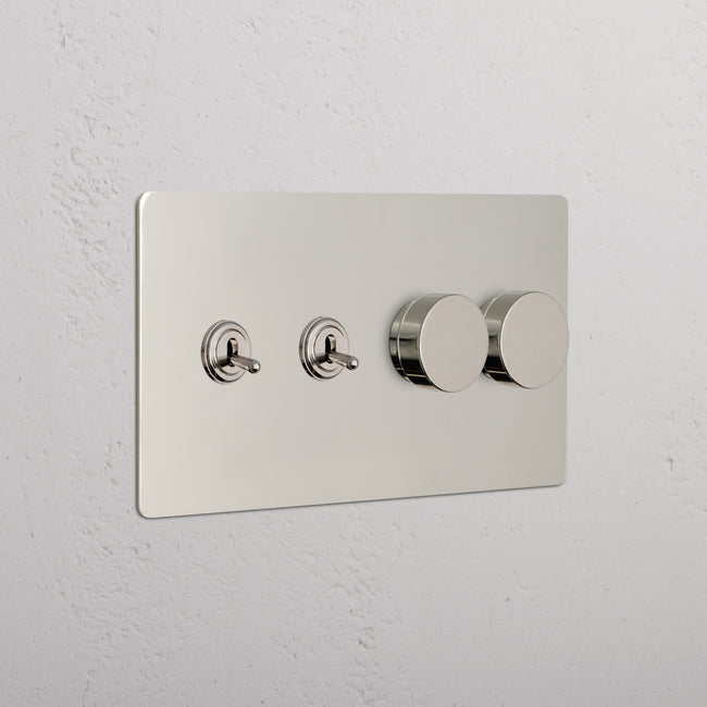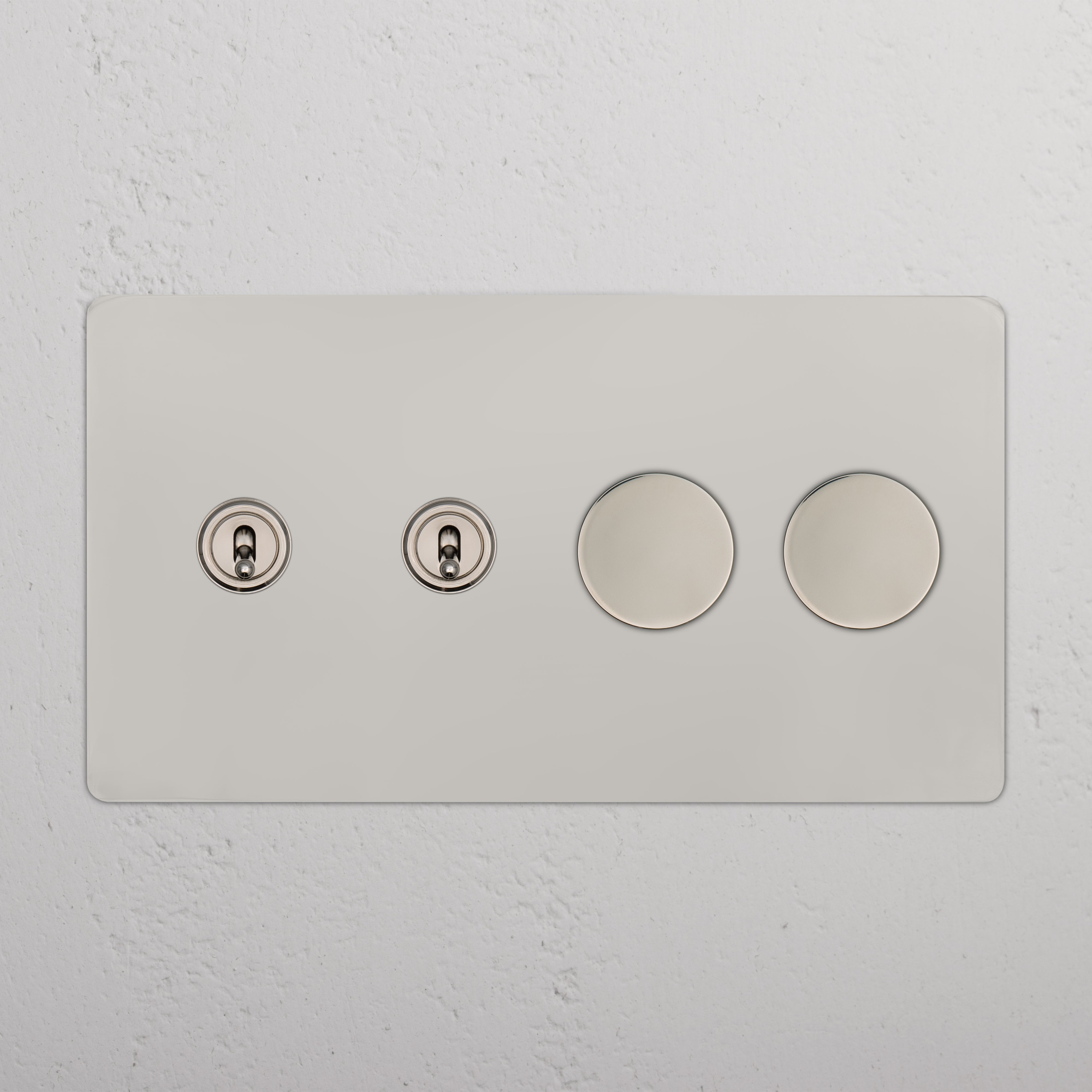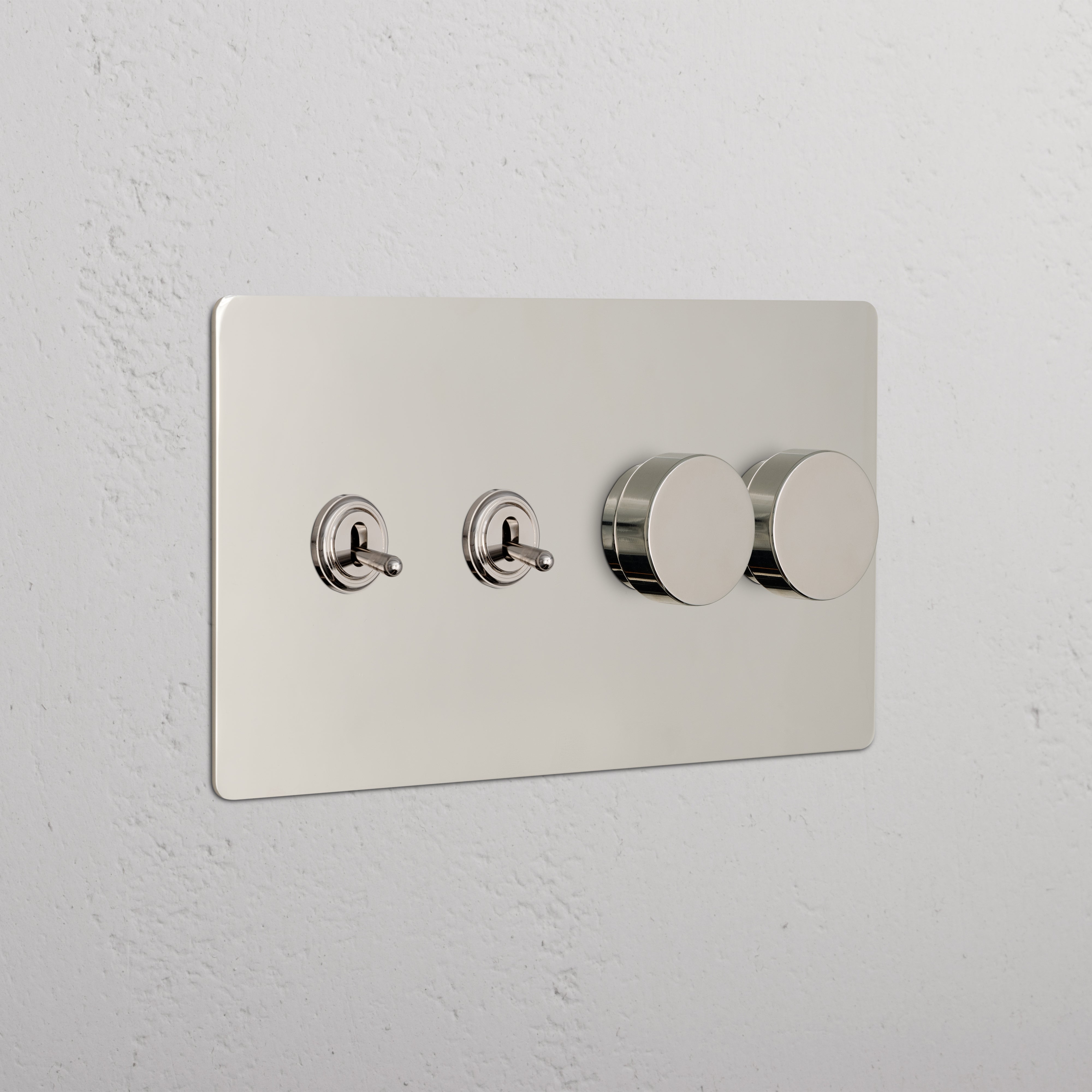 This 4 gang mixed switch combines two three-way toggles and two rotary dimmers on one plate.