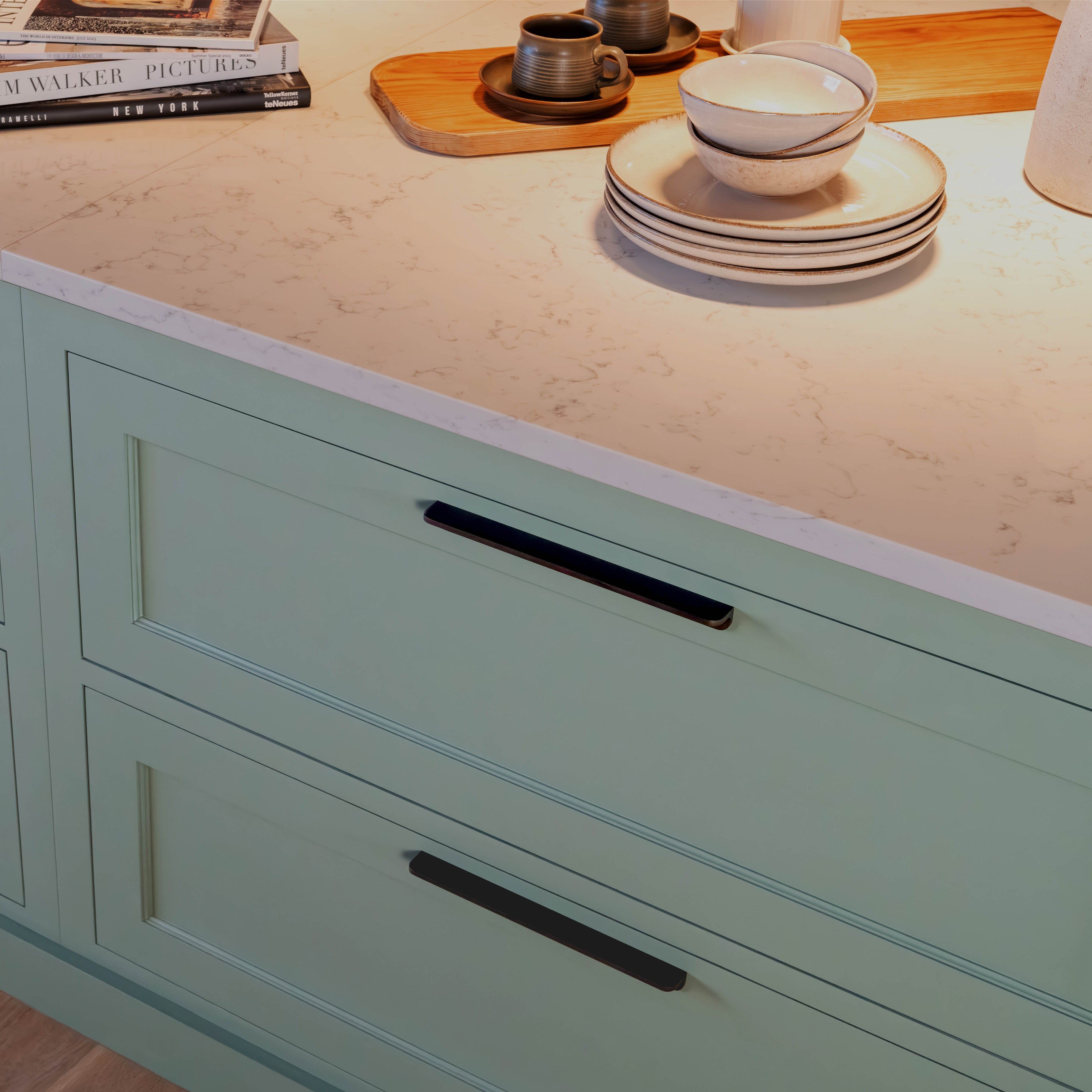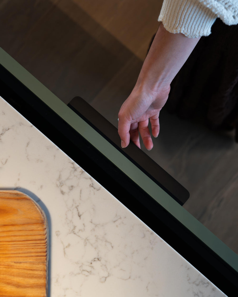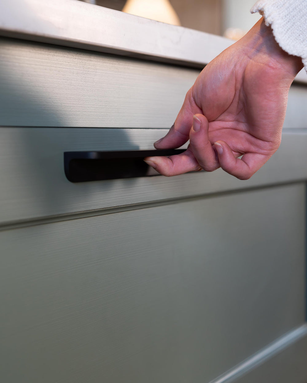 A modern, refined take on an edge pull handle with recessed grip detail for a firm hold.